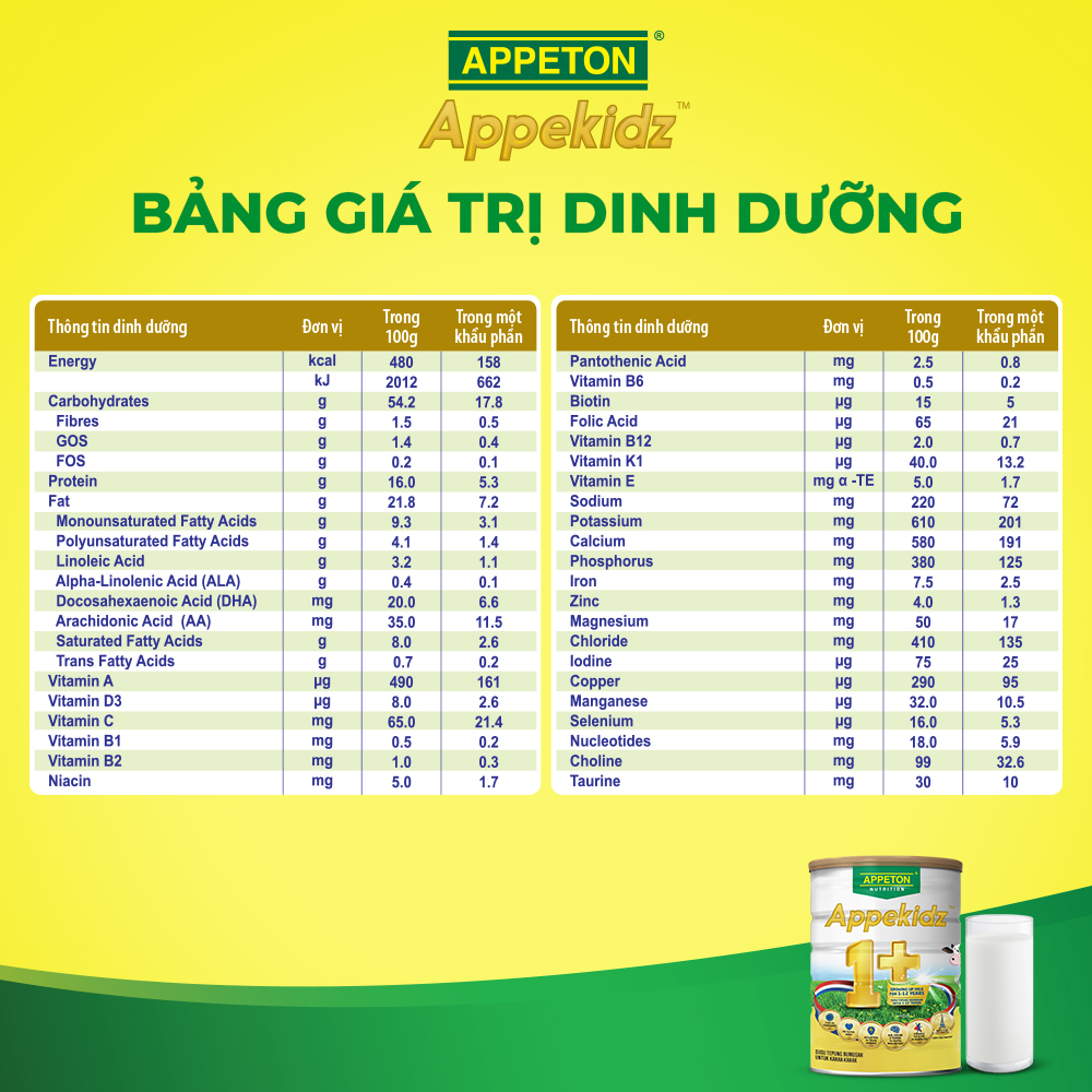 Appeton Appekidz là công thức độc quyền với hệ thống miễn dịch IMMU gồm Nucleotides, DHA, Taurine, Choline, FOS và GOS, giúp hỗ trợ sự phát triển toàn diện cho trẻ.