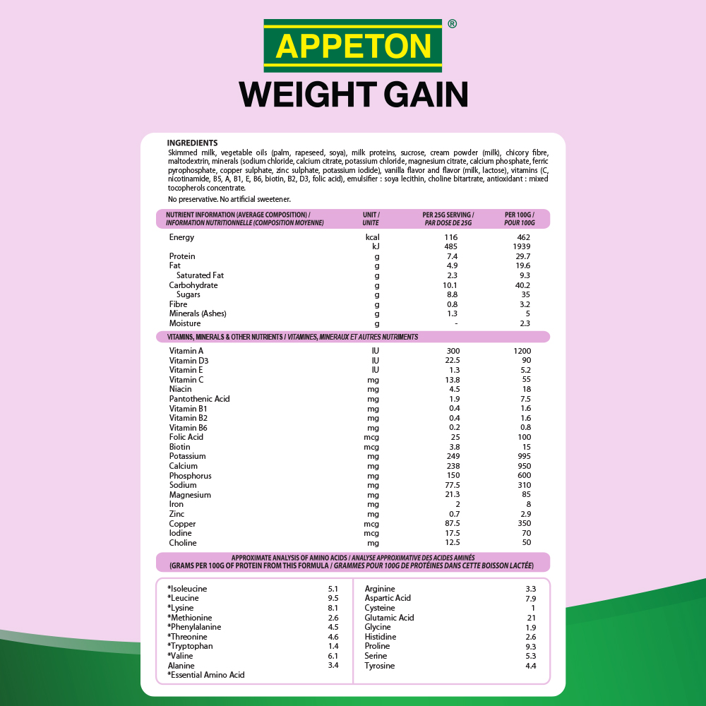 • Appeton Weight Gain chứa hàm lượng đúng amino axít cẩn thiết cho sự phát triển thể chất.